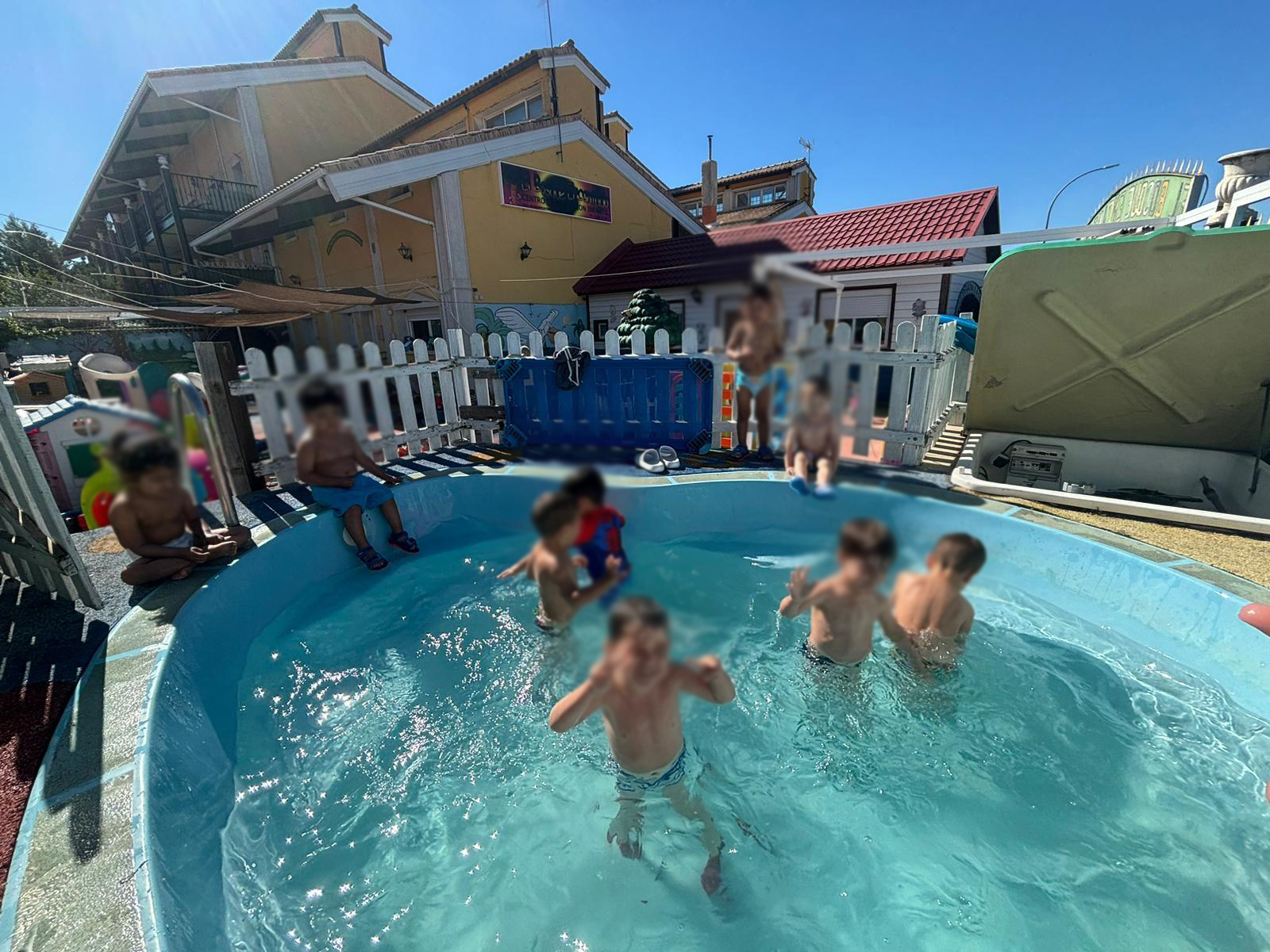 Y qué mejor manera de celebrarlo, que bañándonos en nuestra piscina exterior en un patio de 200m rodeado de nuestra colchoneta, columpios, toboganes, arenero, motos, coches…
