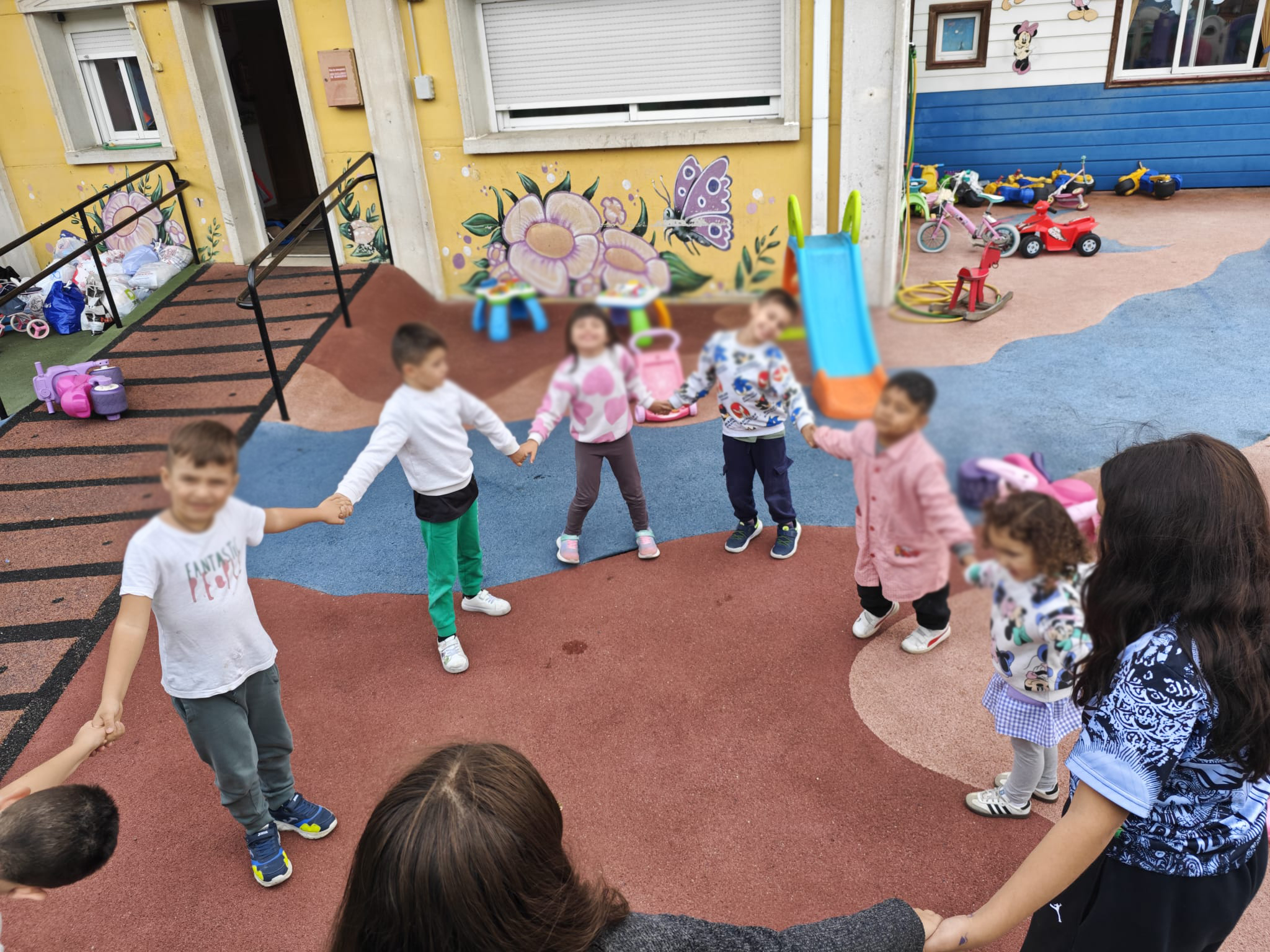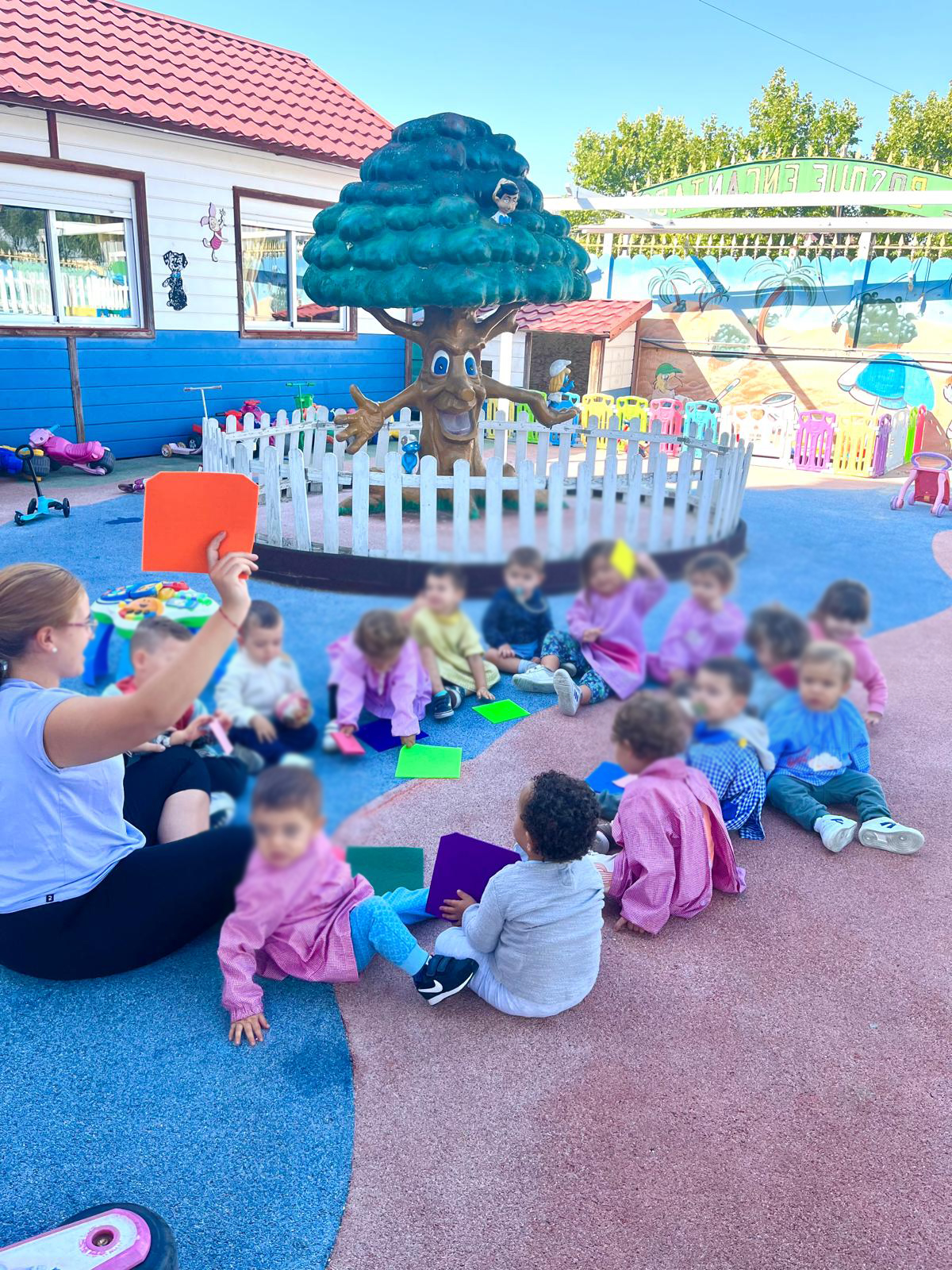 Aprovechando el buen tiempo y nuestro gran patio, nuestros niños observan y aprenden diferentes formas geométricas, colores y texturas.